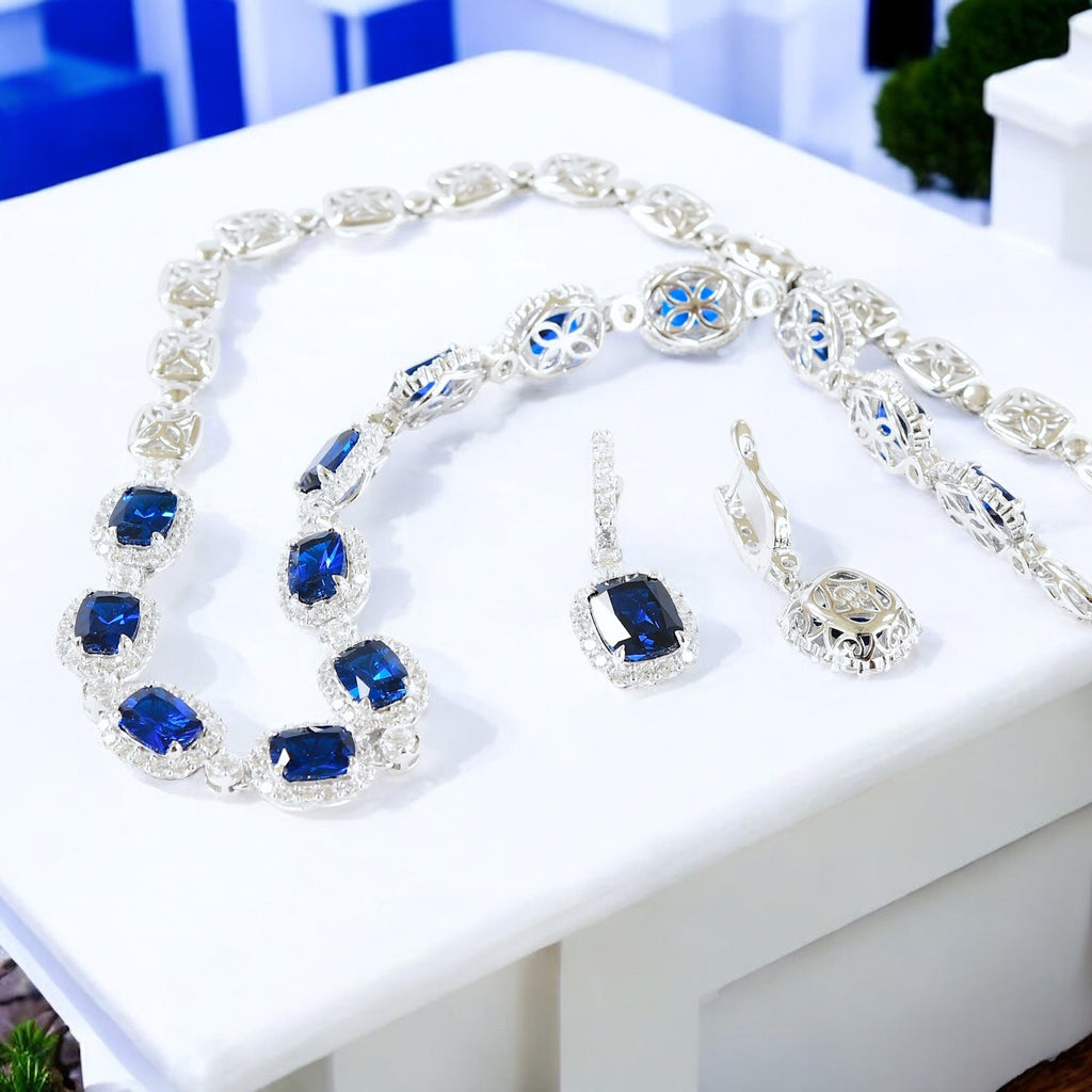 The necklace showcases a graceful cascade of ice-cut simulated sapphires, each one reflecting the crystalline lagoons of the Maldives - depths of blue that mirror the soul’s purest emotions. Framed with brilliant zirconium accents, these stones shimmer like sunlight dancing across gentle waters.