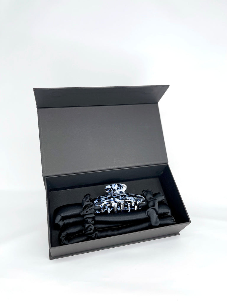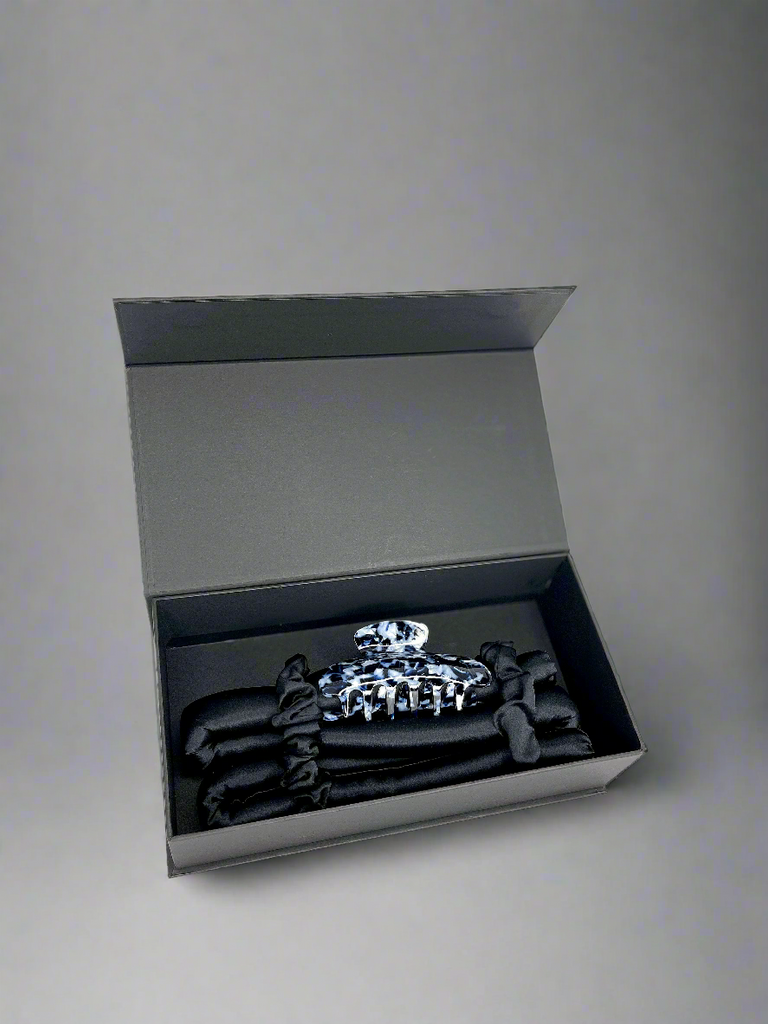 • Package Weight & Description: Package includes one satin rope, two satin scrunchies, and one claw hair clip. Box is 12"x4".